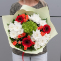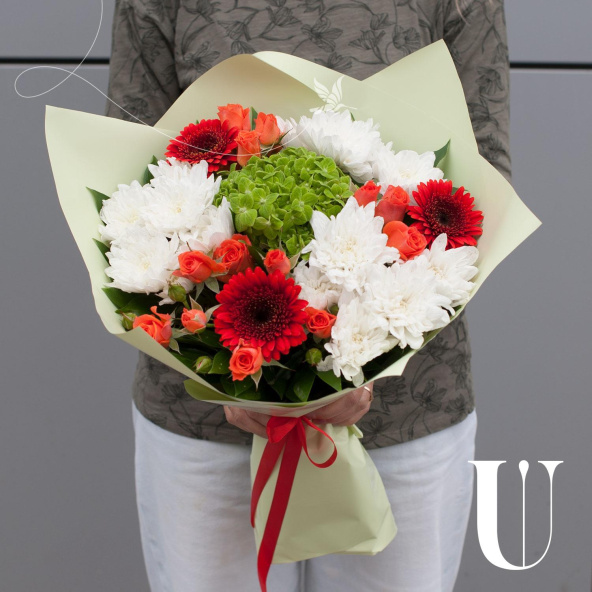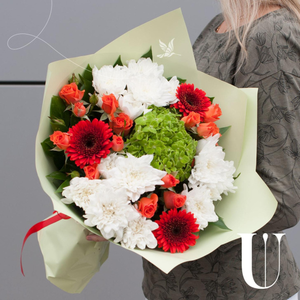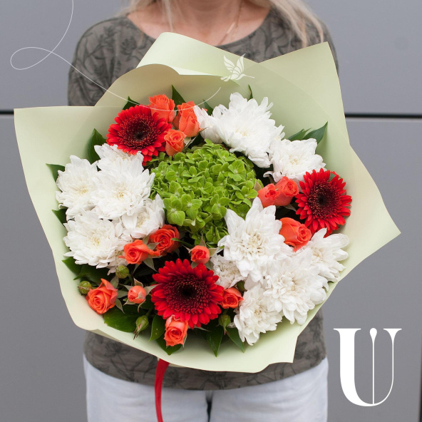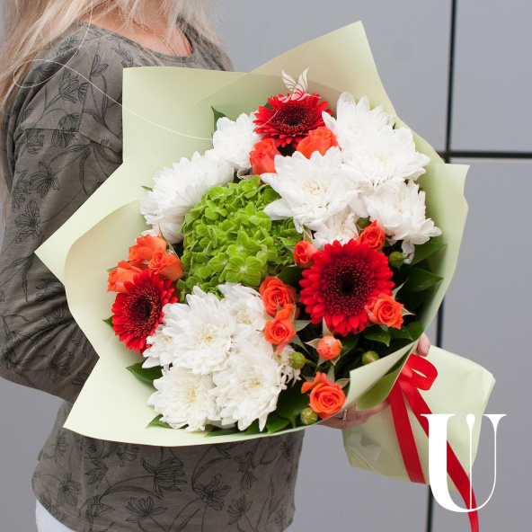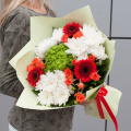 Букет оформлен в разноцветных тонах, что придает ему яркость и насыщенность. В составе букета 10 цветов, включая хризантемы, гортензии, кустовые розы и минигерберы.