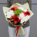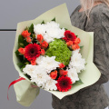 Букет цветов "Манакара" - это сборный букет, состоящий из хризантемы, гортензии, кустовой розы и минигербер.