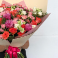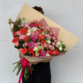 Букет из красных роз и розовых эустом в дизайнерской упаковке