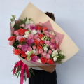 Букет в фиолетовой гамме из роз Миритим и кустовых пионовидных роз в упаковке