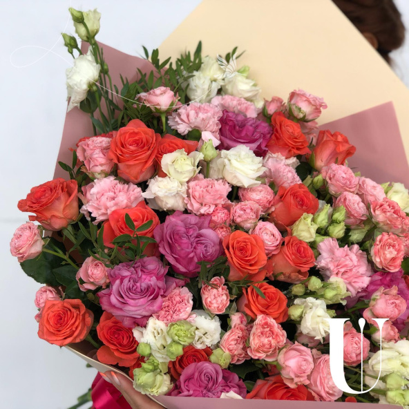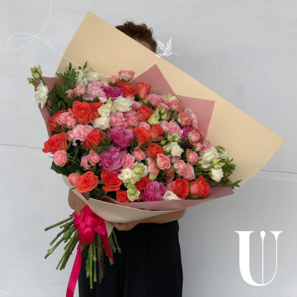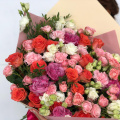 Букет из розовых кустовых роз, нежных эустом и статицы в упаковке