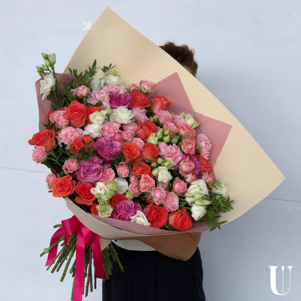 Великолепие роз в сочетании с эустомой непременно порадует получателя