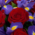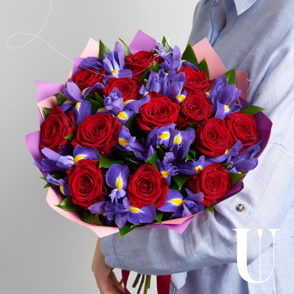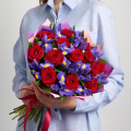 Классический букет из красных роз, розовых маттиолы и альстромерий в розовой упаковке
