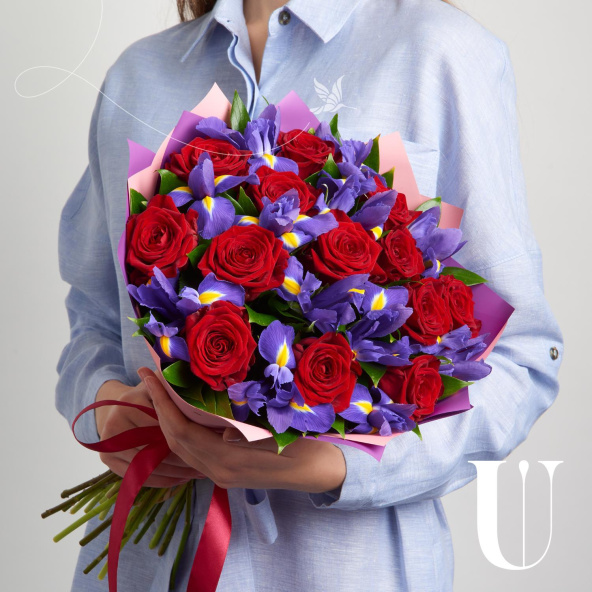 Букет из роз сорта Эль Торо, мини гербер и лизиантуса в дизайнерской пленке