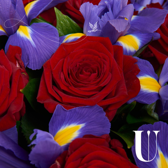 Букет из роз сорта Мондиаль и синей гортензии в матовой пленке