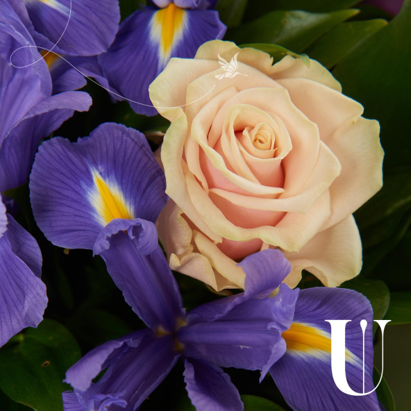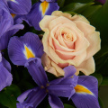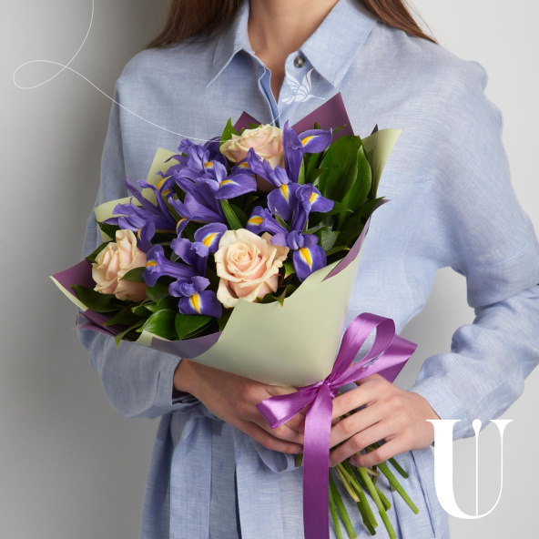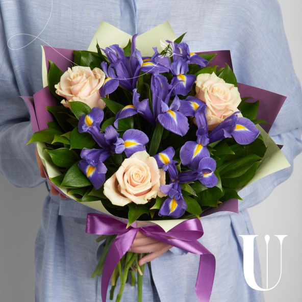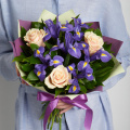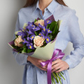 Букет из розовых роз и синих ирисов в матовой пленке