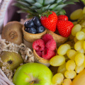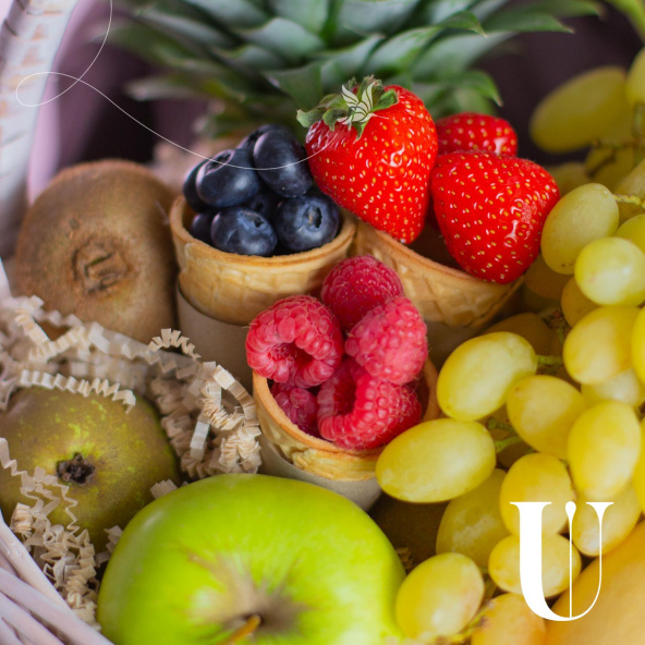 Состав: ананас 1 шт, банан 6 шт. киви 2 шт, груша конференц 2 шт, яблоко зеленой 1 шт, манго желтое 1 шт, виноград зеленый 0,5 кг ветка, вафельный рожок Клубника 70 гр, вафельный рожок голубика 80 гр, вафельный рожок малина 80 гр., наполнитель.