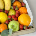 Набор ароматных цитрусов, сладких яблок, свежих бананов и киви, дополненный сочными ягодами клубники.