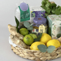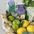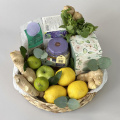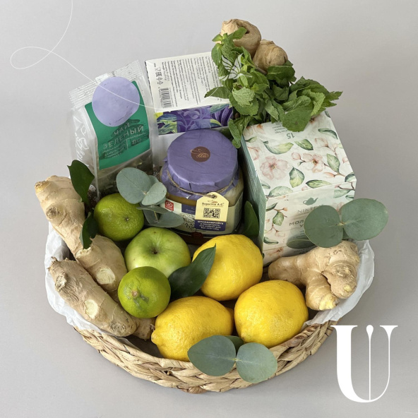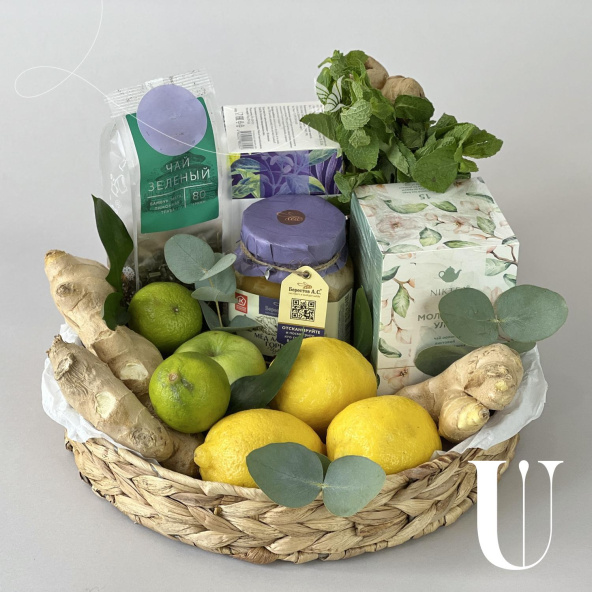 Яркая композиция в плетеной низкой корзине с различным чаем, горным мёдом и мятой. Чайную симфонию успешно дополняют зеленые яблоки, лимоны и имбирь.