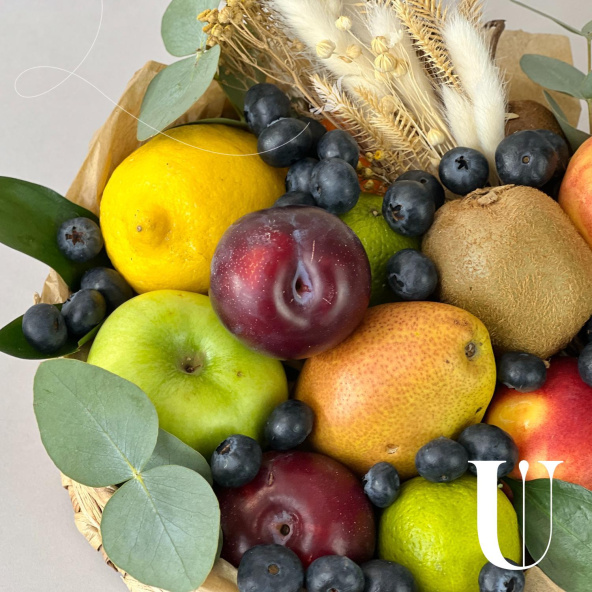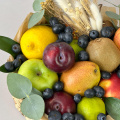 Корзина всех наших любимых фруктов - груши, яблоки, киви и нектарины составляют яркую композицию, притягивающую взгляд и пробуждающую аппетит. Разбавляет это изобилие сочная голубика и веточки зеленого эвкалипта.