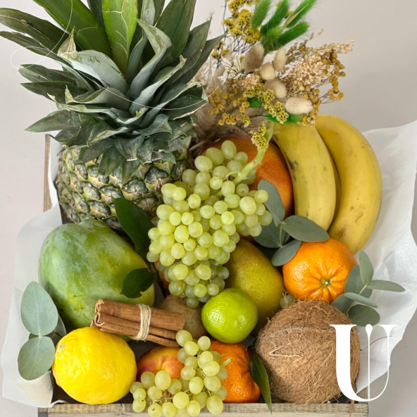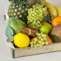 Большой ящик свежих тропических фруктов, украшенный эвкалиптом и сухоцветами, станет достойным подарком руководителю, другу или любимому человеку.