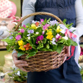 Композиция в фиолетовых тонах из роз, сантини, гвоздик в серой корзине