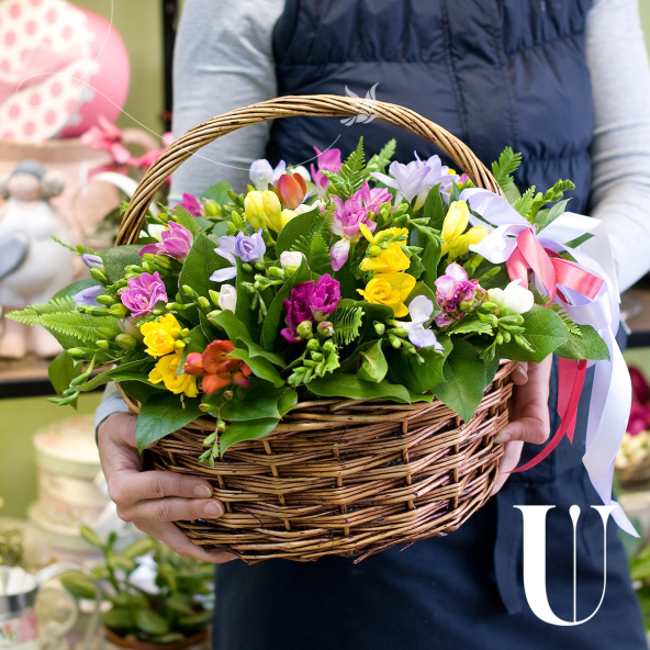 Композиция из розовых роз и кремовых кустовых роз в корзине