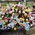 Композиция из розовых кустовых пионовидных роз и розовых маттиол в корзине