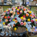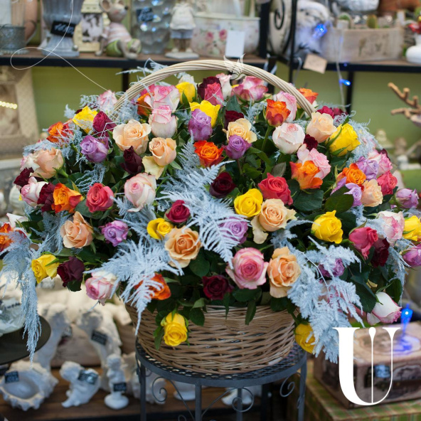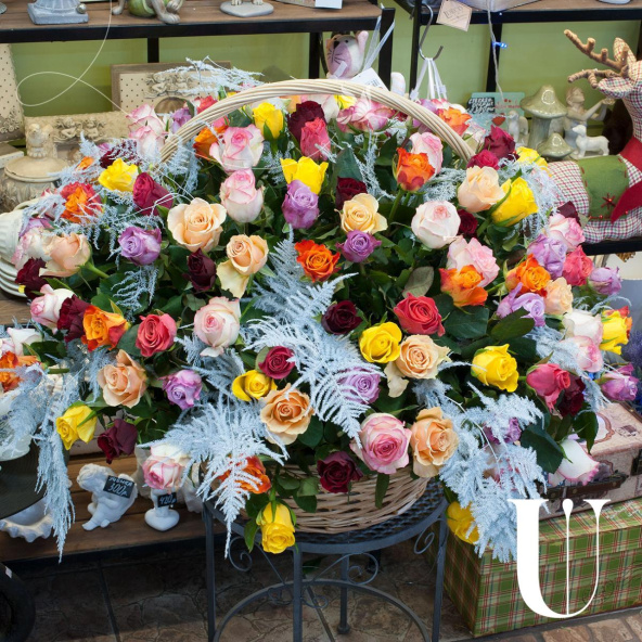 Корзина 151-а роза кения, аспаргус-плюмозус заснеженный 10, корзина