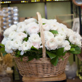 Огромная композиция из розовых пионовидных роз, сирени, белых диантусов и других цветов в корзине