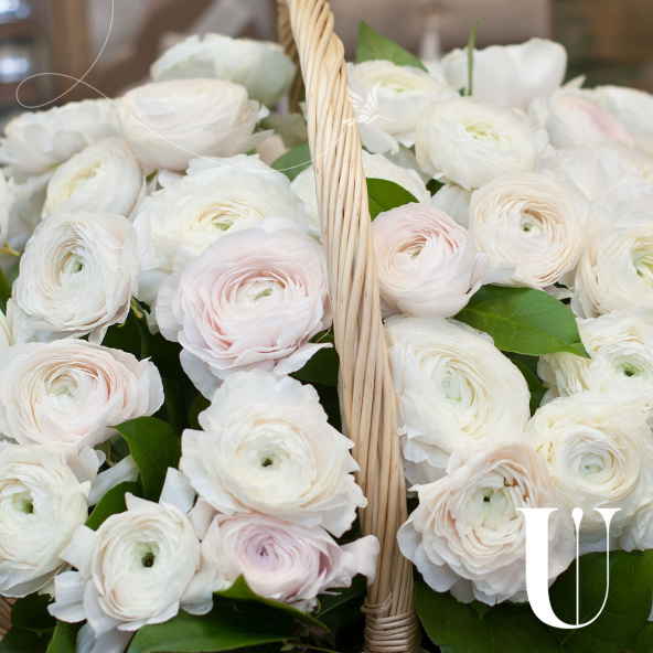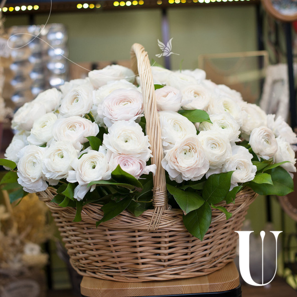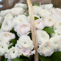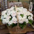Композиция из розовых пионов, сирени и белых пионовидных роз в корзине