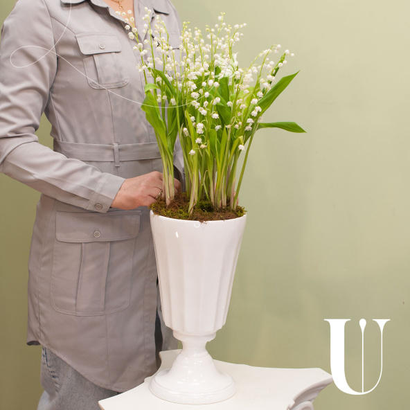 Большая композиция из роз Вайт Охара, белых орхидей и фиолетовых эустом в корзине
