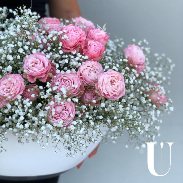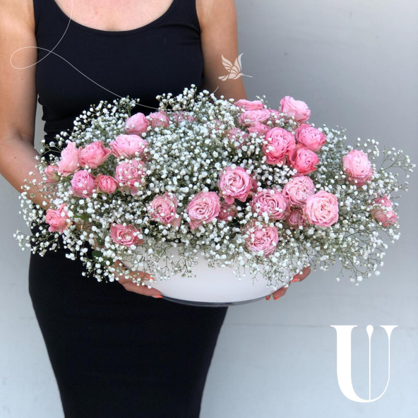 Композиция из роз Аваланж, белых эустом и розовых кустовых роз в корзине