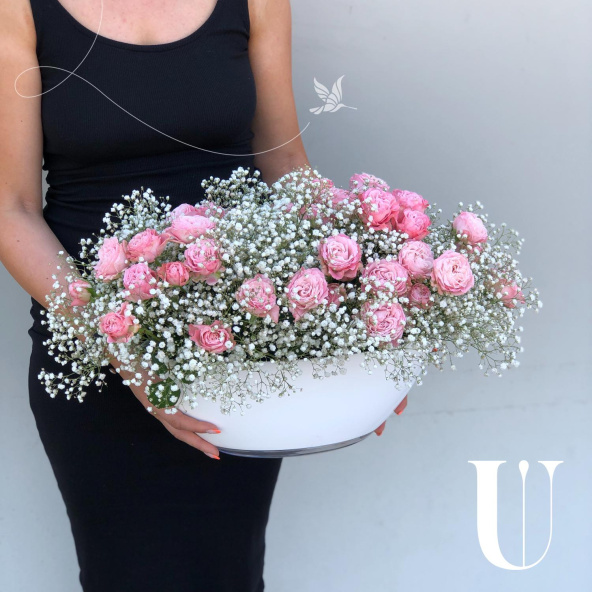 Нежнейшая роза и невесомая гипсофила в красивой декоративной вазе, помогут вам порадовать получателя