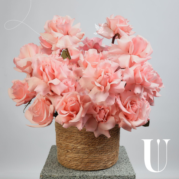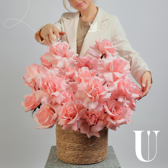 Вывернутые розы сорта Нина в плетеном кашпо