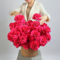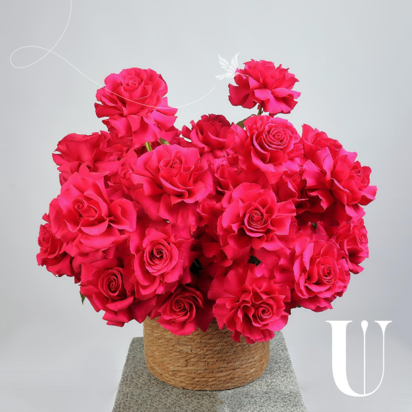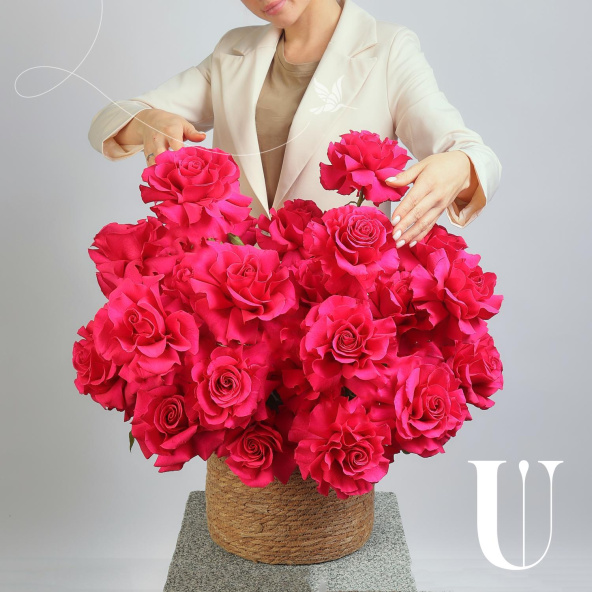 Вывернутые розы сорта Нина в плетеном кашпо
