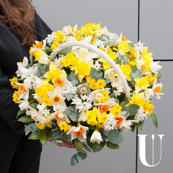 Цветочная композиция выполнена в виде корзины, что придает ей особый шарм и элегантность. Корзина с нарциссами станет отличным подарком для любого человека, будь то бабушка, деловой партнер, любимая, мама, коллега или ребенок.