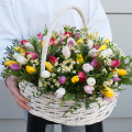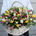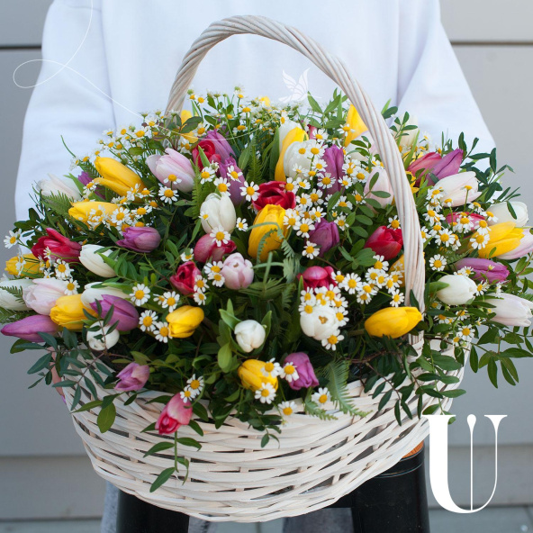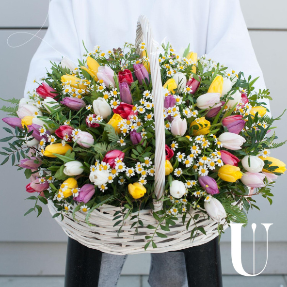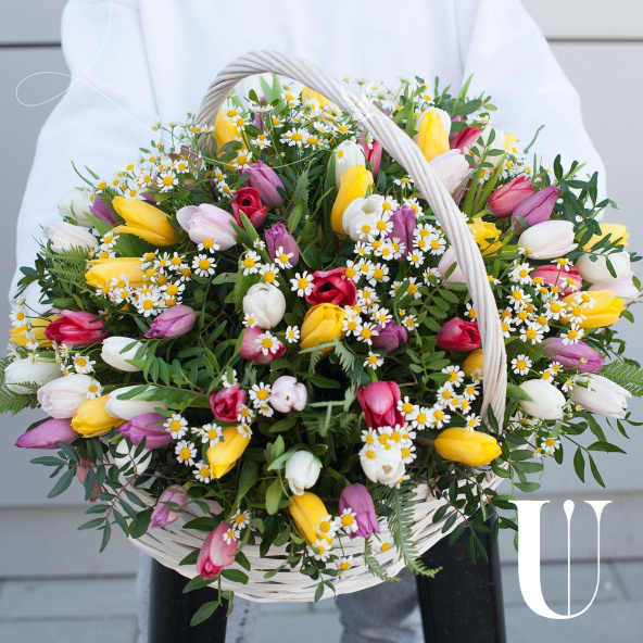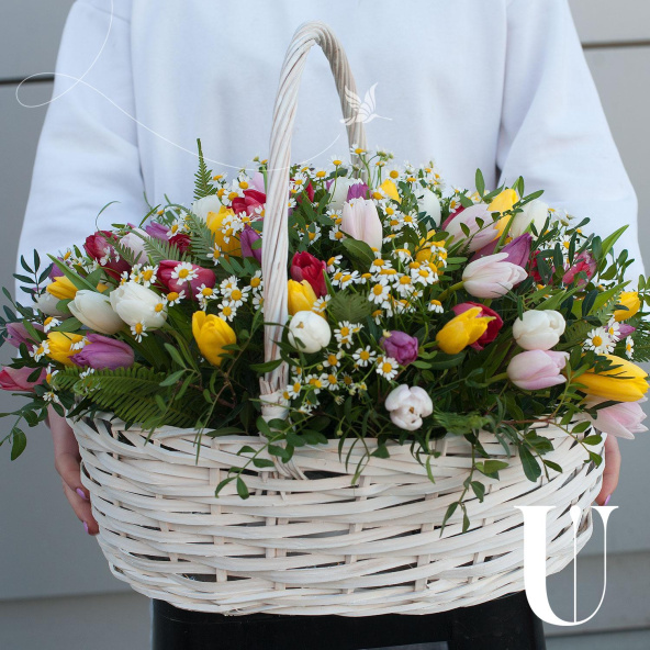 Корзина из весенних цветов "Тюльпаны с ромашками" - это уникальное сочетание красоты и свежести.
