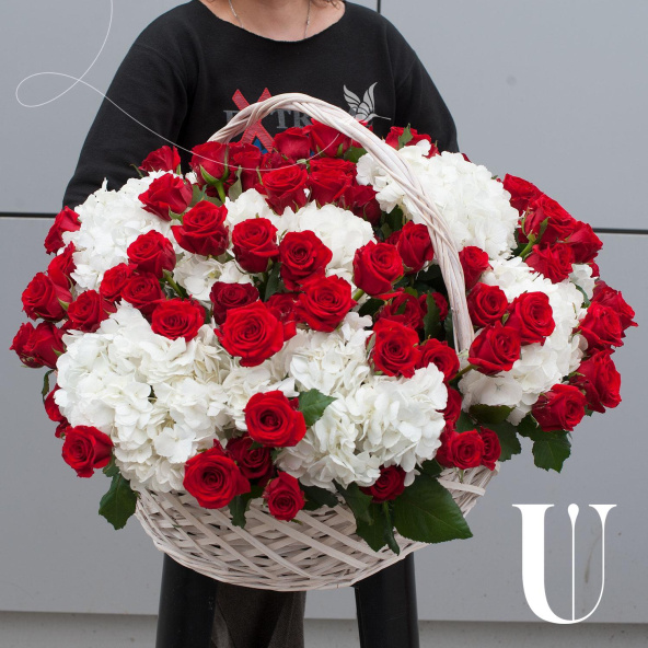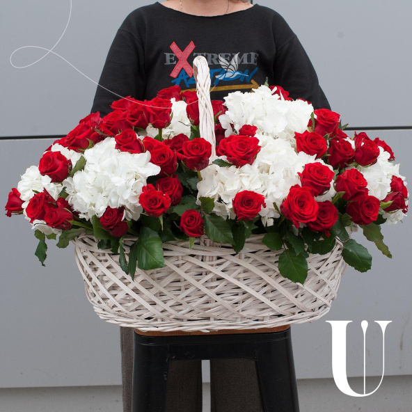 Корзина из ярких красных роз и белой гортензии "Viva la Vita" - это уникальное сочетание цветов, которое станет отличным подарком для любого случая.