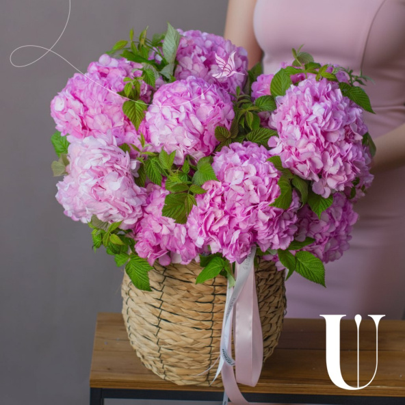 Композиция в белой гаммме из белых лилий, маттиол и кустовых роз в корзине