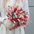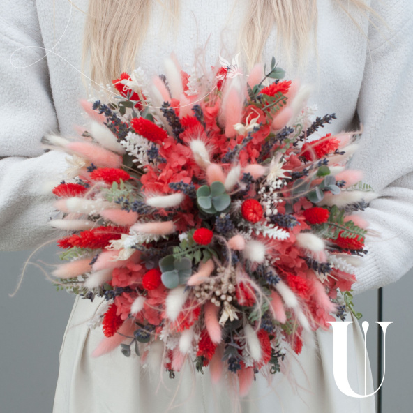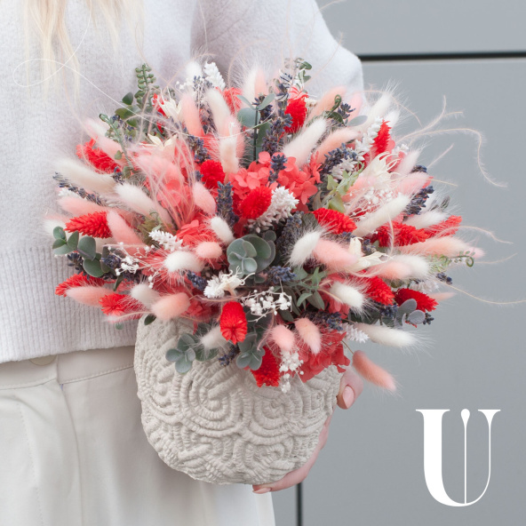 В состав композиции входят такие цветы, как лагурус, гортензия, фалярис, лаванда, ковыль и гипсофила. Это позволяет создать уникальный и яркий акцент в интерьере, который будет радовать глаз своим неповторимым видом.