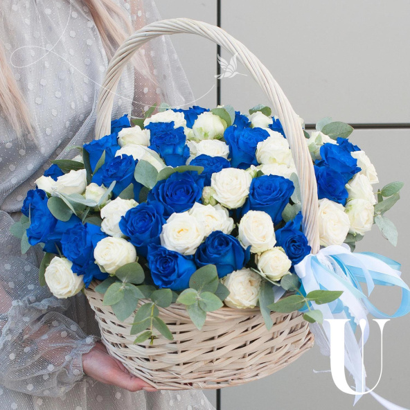 Композиция в корзине выполнена из синих роз и белых пионовидных кустовых роз, что придает ей неповторимый и стильный вид.