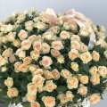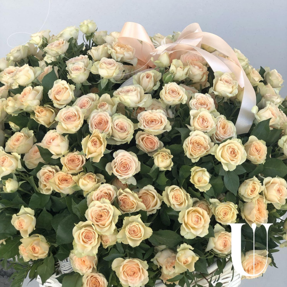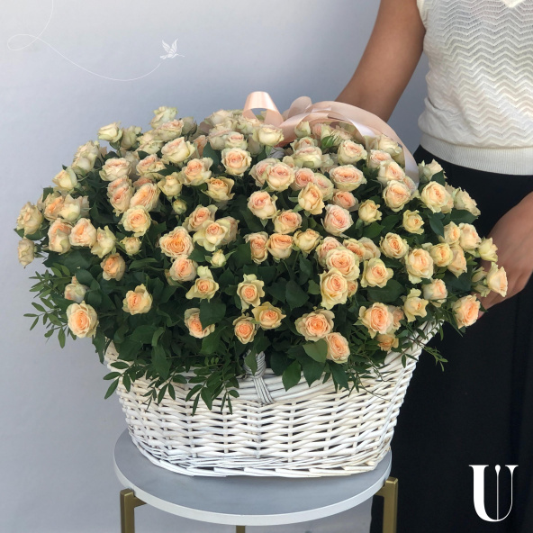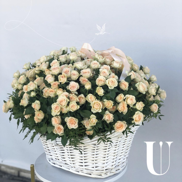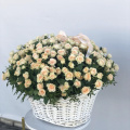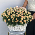 Композиция из розовых орхидей, кустовых роз Лидия и нежно-розовых кустовых диантусов в корзине