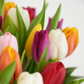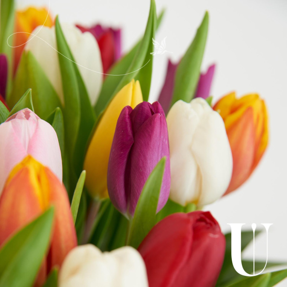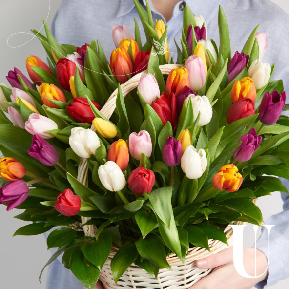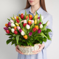 Композиция из фиолетовых и розовых тюльпанов в корзине