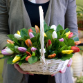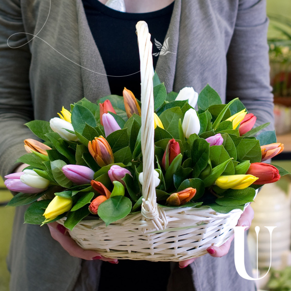 Композиция из 19 роз Аваланж 60 см в белой корзине