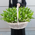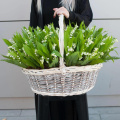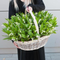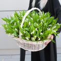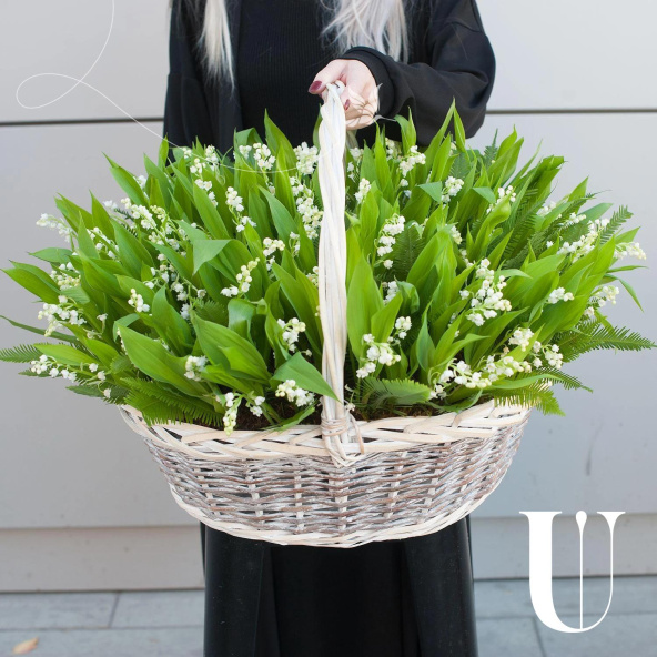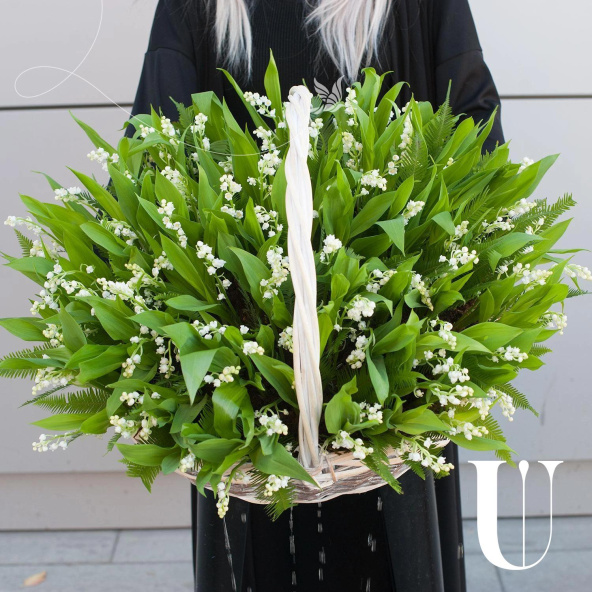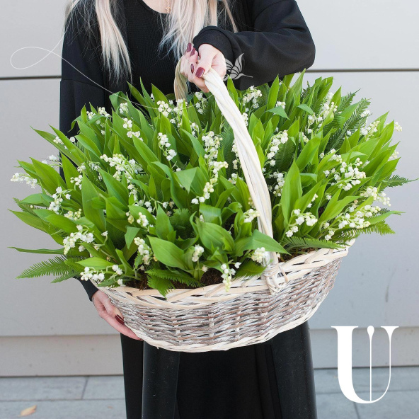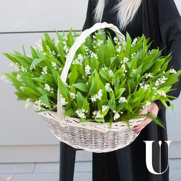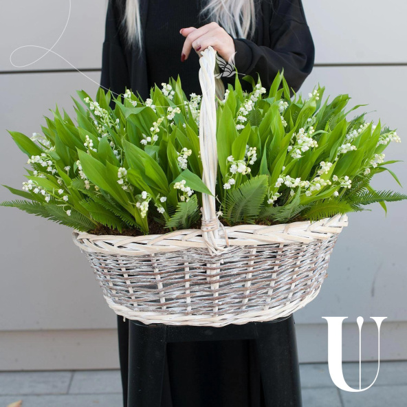 Корзина выполнена в виде композиции из 100 белоснежных ландышей, что придает ей особую нежность и изящество. Зелень амбрелла и мох добавляют естественности и гармонии, делая композицию еще более привлекательной.