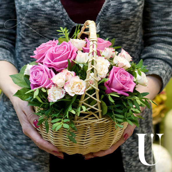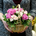 Композиция из розы Ангажемент, белой гортензии и розового диантуса в корзине
