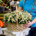 Летняя композиция из гвоздик, ромашки и сантини в круглой корзине