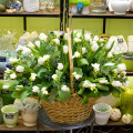 Композиция из орхидей, маттиол и диантусов в плетеной корзине
