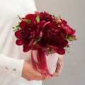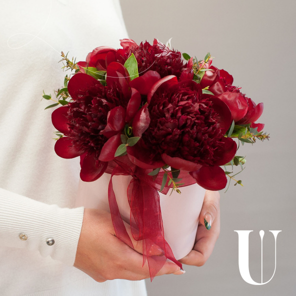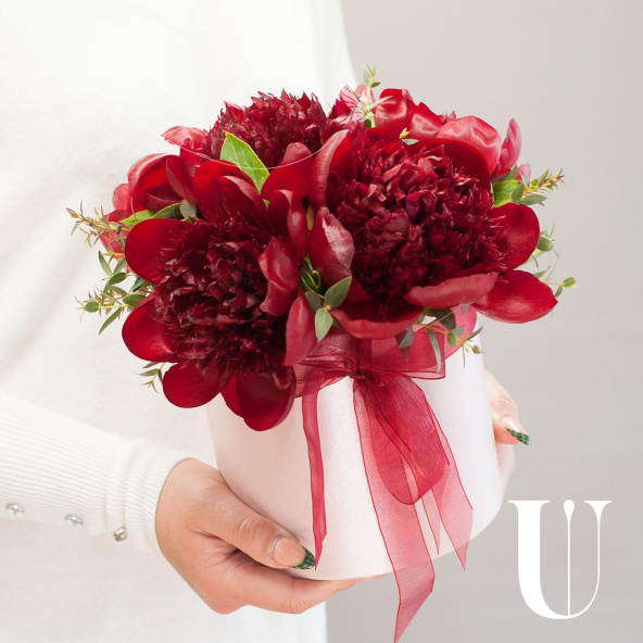 Коробка с пионами "Оттенки Бургундии" - это не просто букет, это настоящее произведение искусства, которое будет радовать глаз и вызывать улыбку на лице получателя.