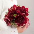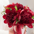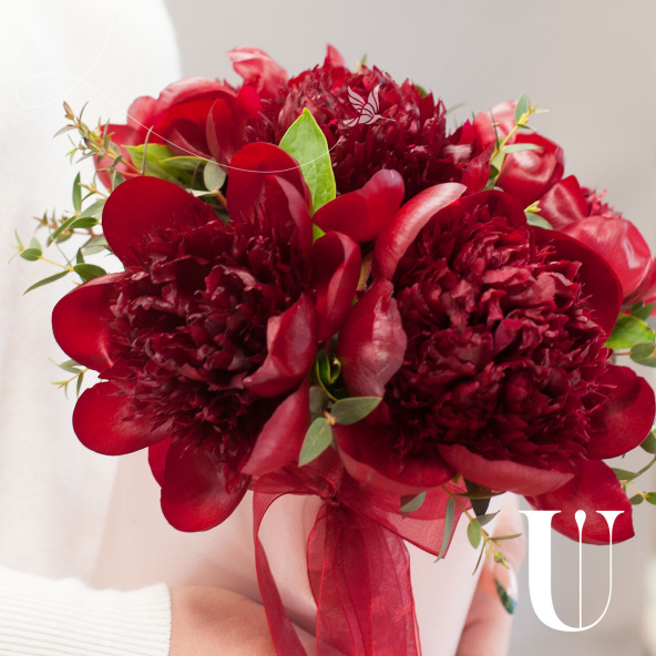 Букет состоит из 5 бордовых пионов, которые являются символом любви и страсти. Эти цветы обладают насыщенным и глубоким оттенком, который придает композиции особую элегантность и шик.