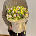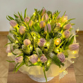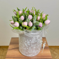 Розовые лизиантусы и питтоспорум в шляпной коробке