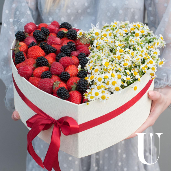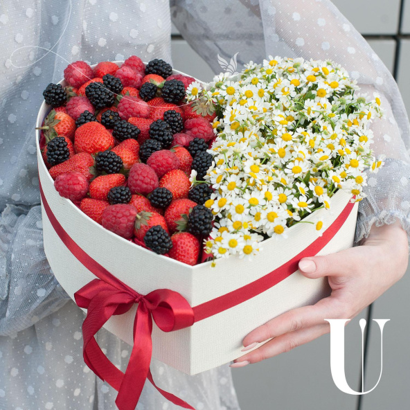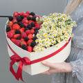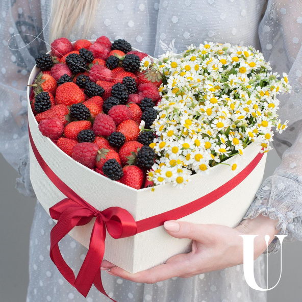Коробка с клубникой, малиной, ежевикой и ромашками "Ягодная ромашка" - это композиция в коробке, которая станет отличным подарком для любого повода.