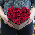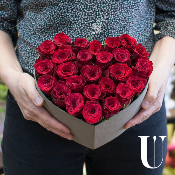 Кустовые красные розы, гиперикум и шоколадные буквы в коробке формы сердца