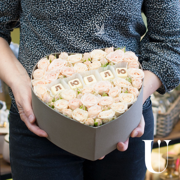 Кустовые красные розы, гиперикум и шоколадные буквы в коробке формы сердца