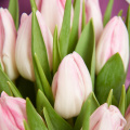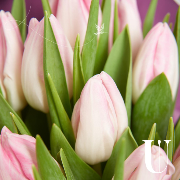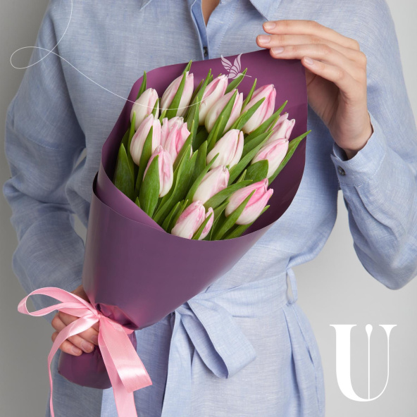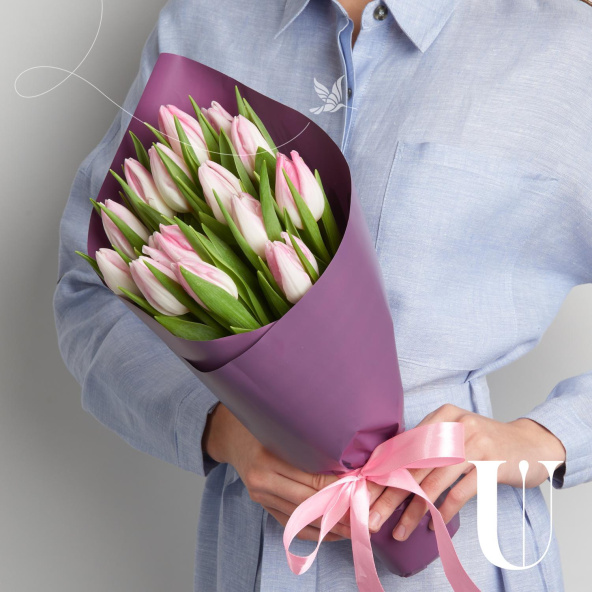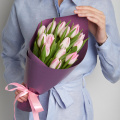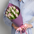 Монобукет из розовых и фиолетовых тюльпанов в упаковке