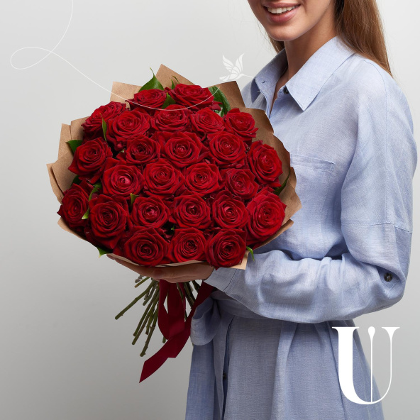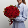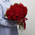 Монобукет из 19 роз сорта Гран При 70 см в крафтовой упаковке
