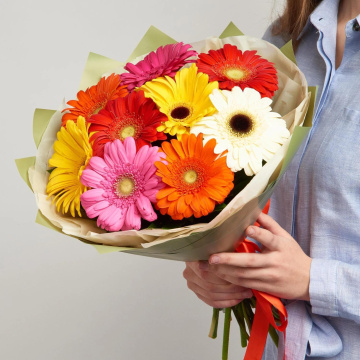 Монобукет из 9 разноцветных гермини в крафтовой упаковке
