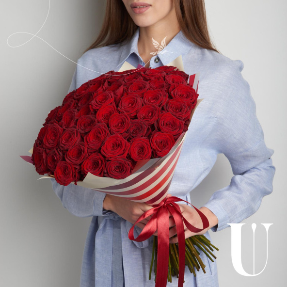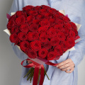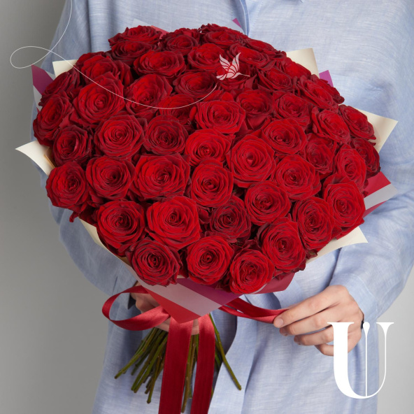 Монобукет из роз сорта Ред Наоми 60 см с атласными лентами