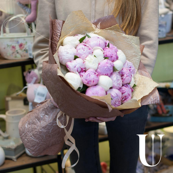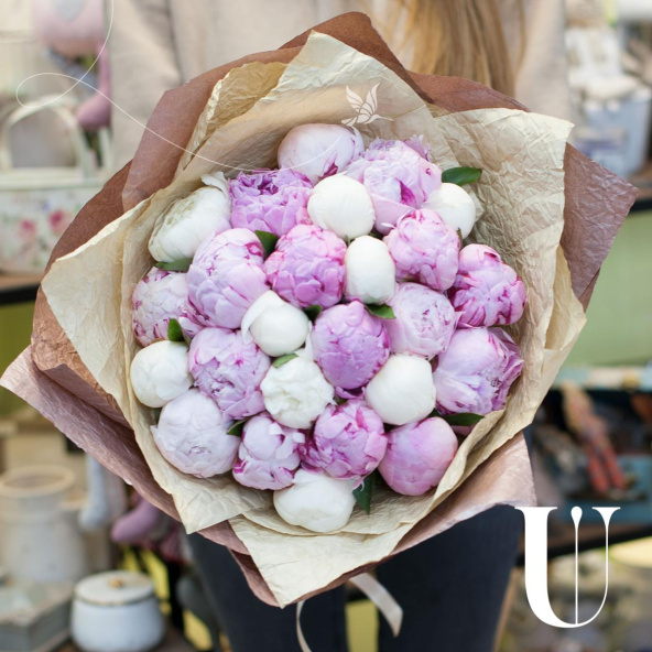 Букет состоит из 27 розовых и белых пионов, что делает его ярким и запоминающимся.